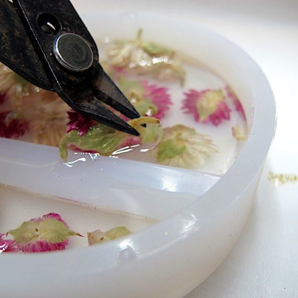 💡 Pro tip: Flowers can trap bubbles that will cure in the resin. Dip your flowers in your resin cup, then put them into your mold.
